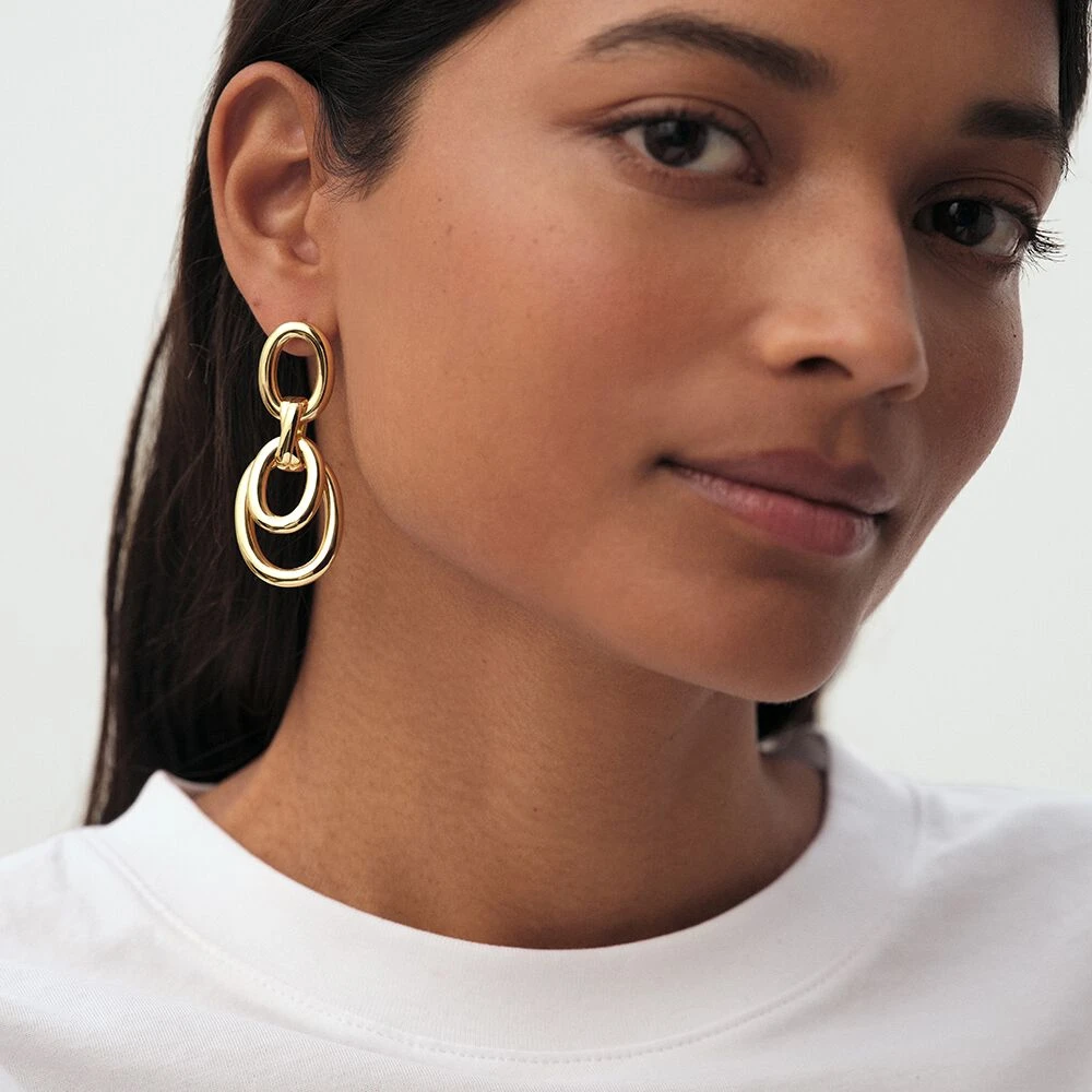 Boucles d’oreilles longues en laiton doré à l’or 750/1000 avec deux anneaux superposés pendants..