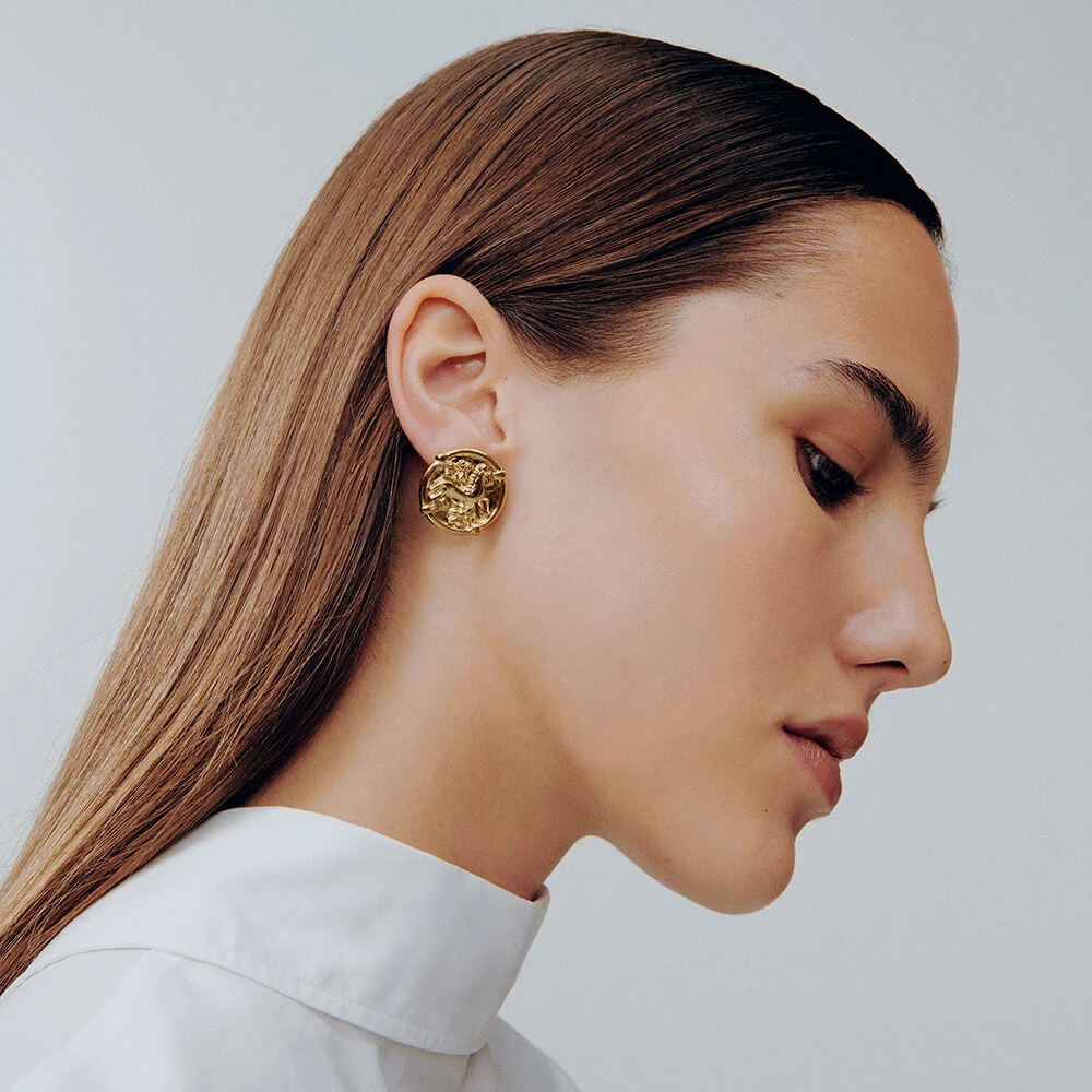 Boucles d’oreilles en métal doré à l’or fin plastron en forme de médaille symbolisant un cheval.