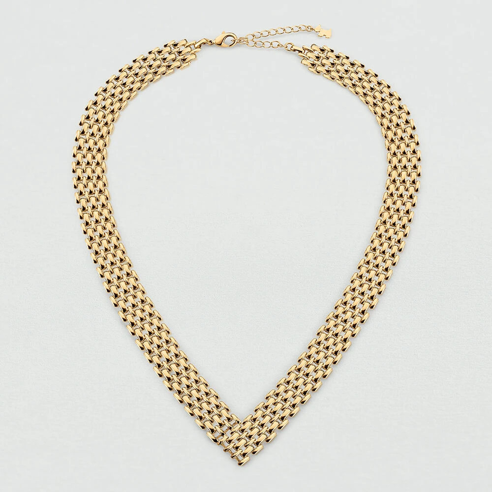 Collier de forme V, en laiton et étain, dont la maille ressemble à une maille de montre. Ce bijou mesure 450mm et contient une rallonge de 50mm
